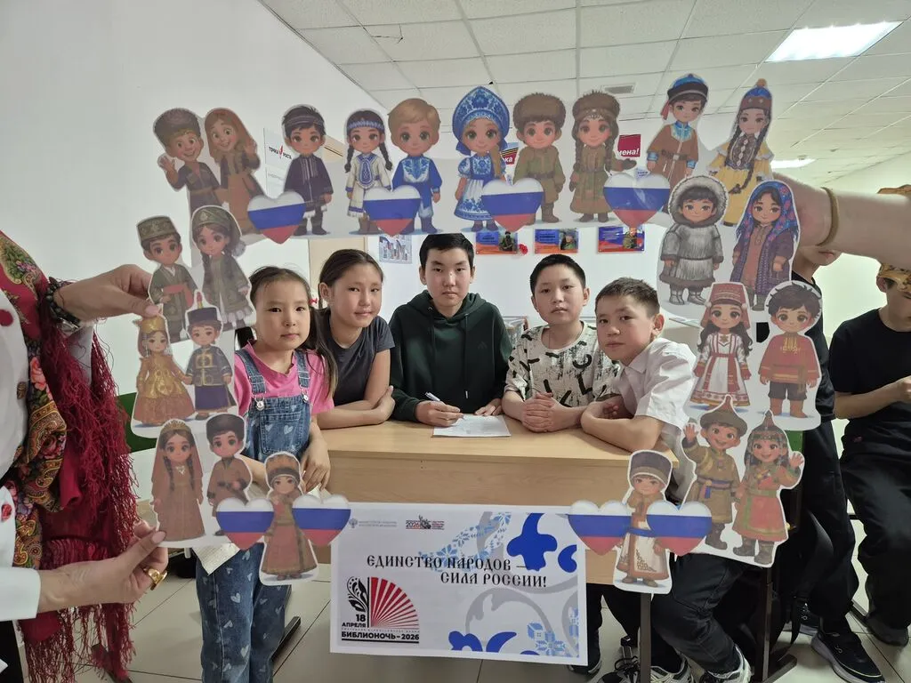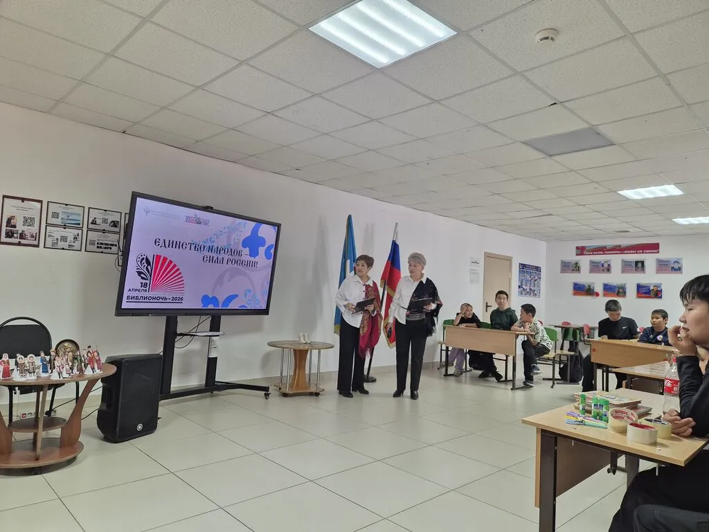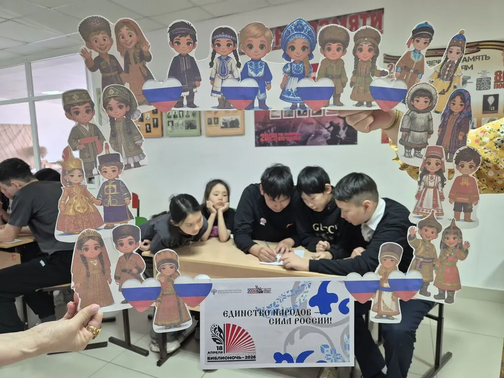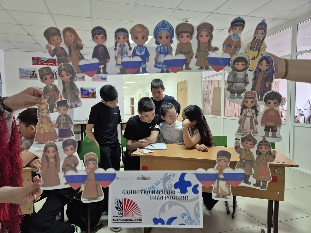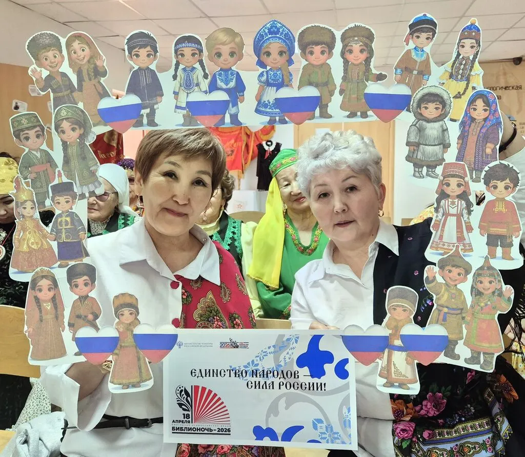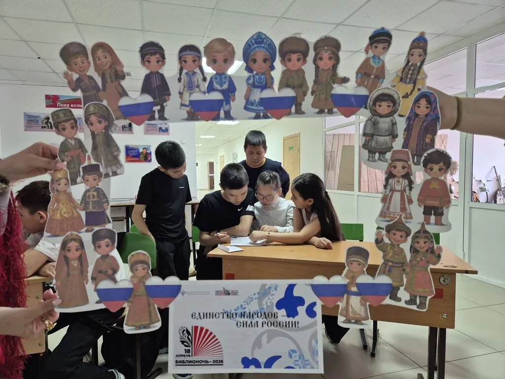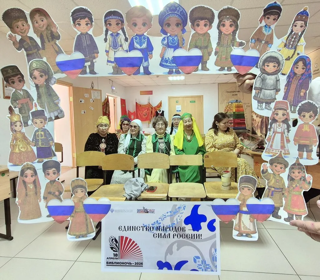 Библионочь - 2026, посвященная Году Единства народов России состоялся 17 апреля совместно со школой. Проведена квест - игра "Путешествие по Родине". Игра прошла по 8-ми станциям: Столица России Москва, Татарстан, Якутия, Бурятия, Тыва, Чечня,станция творчества. Охват 47 человек.